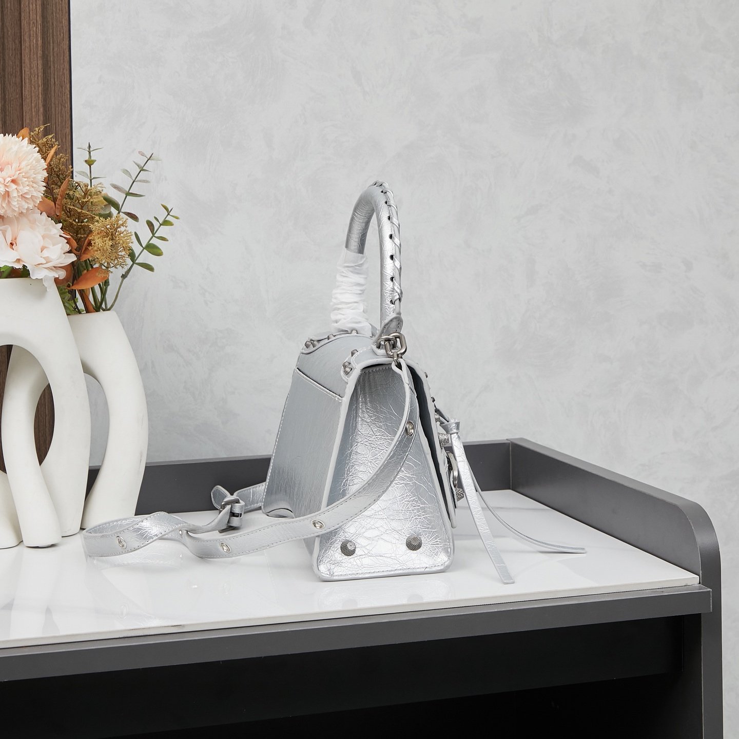 Have you heard of the collaboration between Balenciaga’s Hourglass and Motorcycle bags? Look at this combination of Hourglass and Le Cagole Motorcycle bag. The Hourglass bag body is covered with rose studs from the Motorcycle bag. The black Arena lambskin is full of punk style and quite playful. Size: 23x16x10. Model: 68629 small.