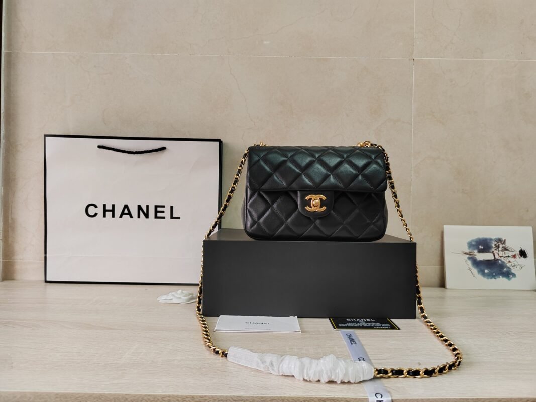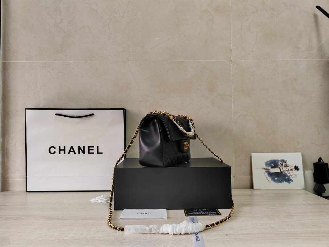 Chane1🧩 Spring/Summer Series 24P pearl chain mini AS4384. The pearl chain and the overall black and gold color scheme are more elegant and noble. This square mini is so beautiful. It can also be carried by hand. It is really amazing and special when worn. It is small, delicate and the physical object is extremely beautiful.