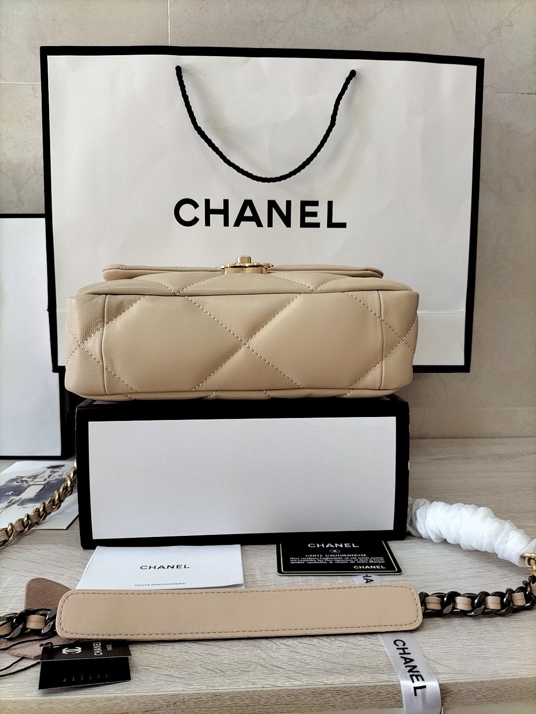 19Bag series gives people a strong retro style, with a little lazy and free, its design inherits a variety of classic elements of the predecessor bag, the whole bag is very fluffy, soft in the hand, color matching hardware chain ⛓ leather to version hardware super positive [strong] CHANEL ❤ silver: white: gold: 3 kinds of metal mixed shoulder straps, thick chain highlights the casual style, this non-shaped bag is different with different clothes back method is very casual, leather wear chain Logo is estimated to be one of the characteristics of 21 years, a hit, the key is each so nice.