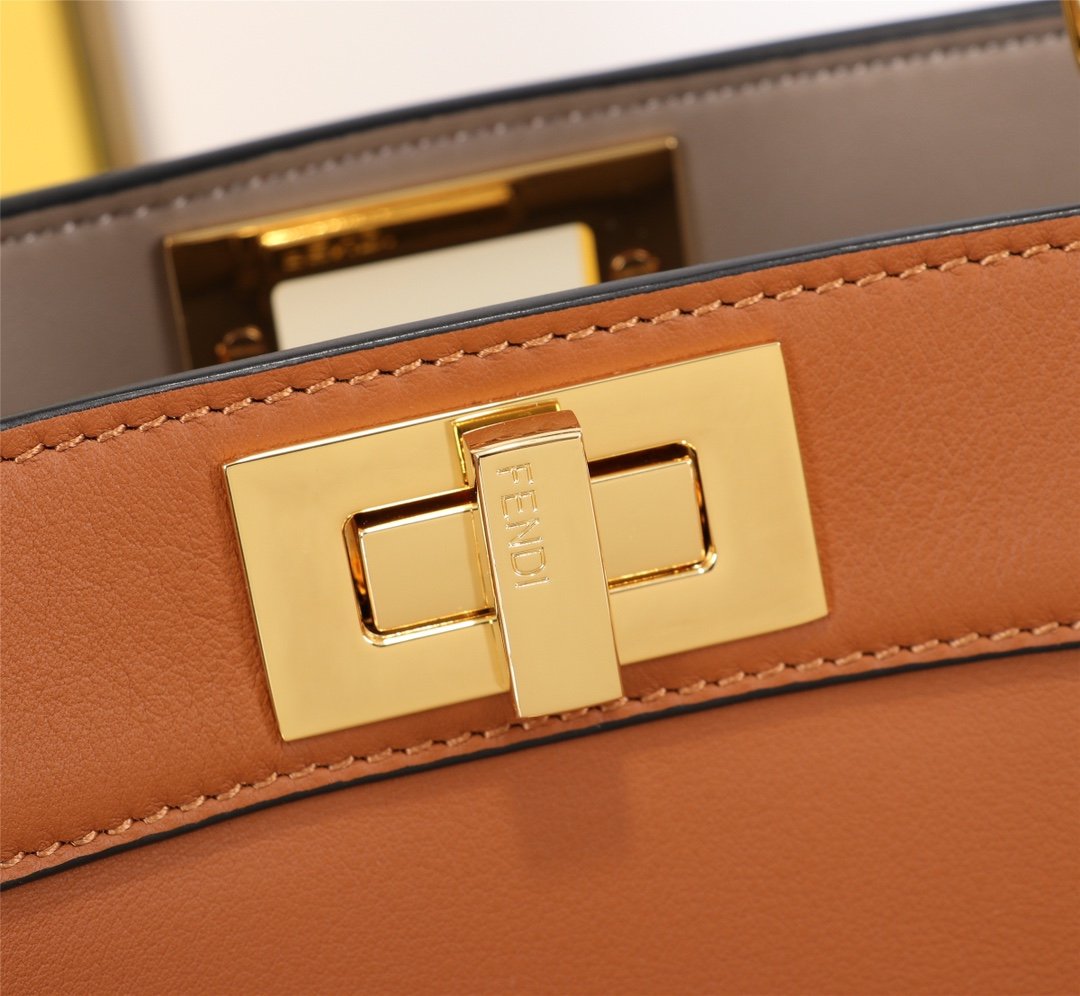 AAAAA grade, top quality. Fendi. Iconic Peekaboo ISeeU small handbag in black leather with classic twist locks on the sides. Pink and brown soft nappa leather lining with two compartments separated by hard baffles with buckle-down interior pockets and gold metal pieces. Handbag with handle and adjustable, removable shoulder strap for hand, shoulder or crossbody.