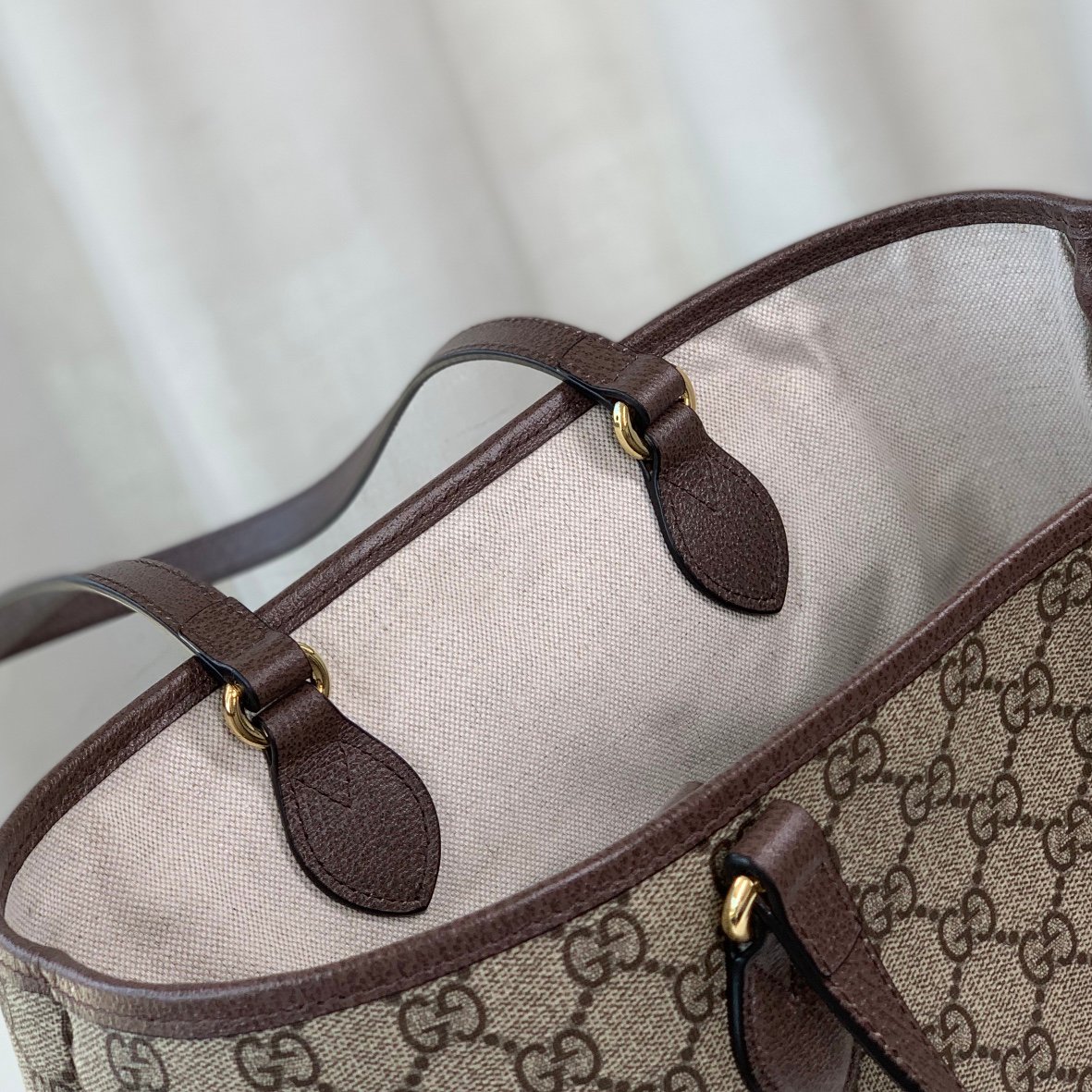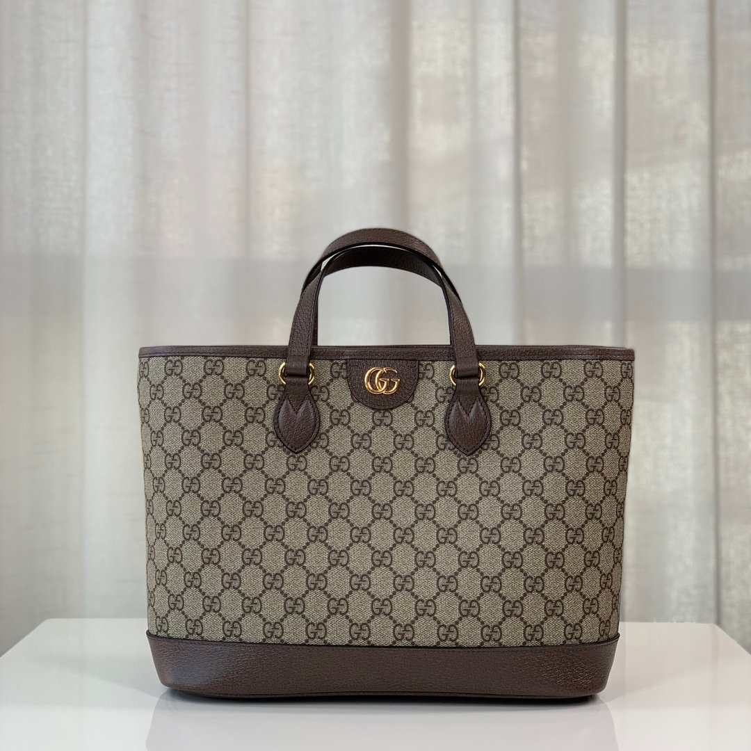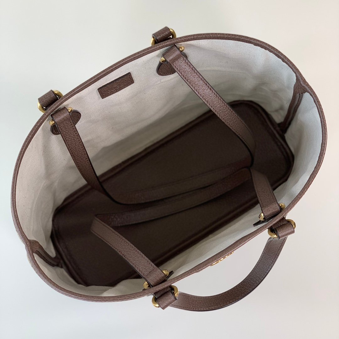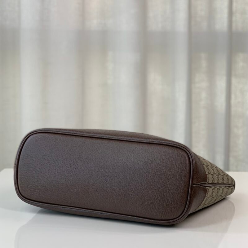 Small shopping bag.GG mini tote bag of Ophidia series. Beige and ebony GG with brown leather and cotton and linen lining.
