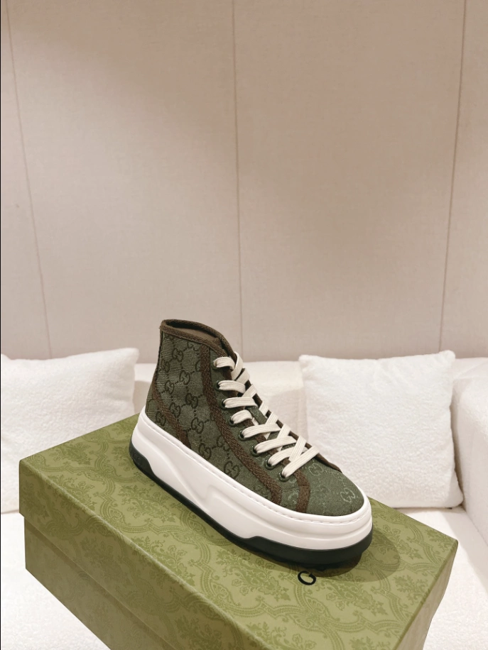 #Gucci #HighTopSneaker #GGSupremeCanvas #TennisInspired #InterlockingG #RubberSole #LaceUp #CasualElegance #FootwearFashion #GucciStyle #IconicDesign