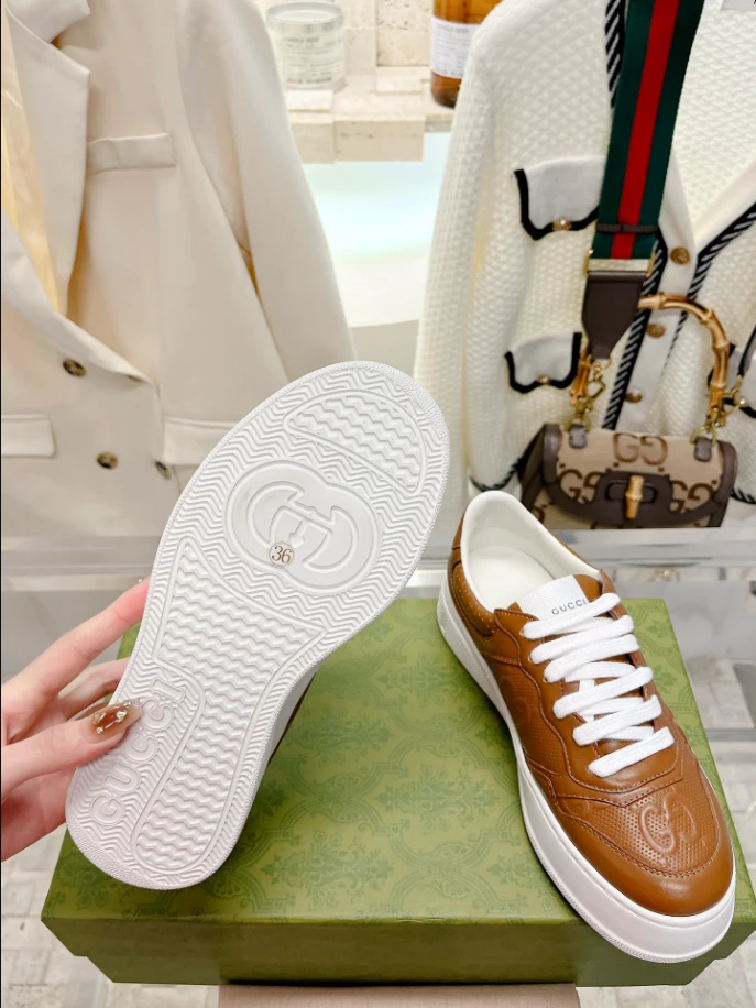 The Men’s GG Sneaker by Gucci, a symbol of timeless sophistication and modern design. Crafted from rich brown perforated GG leather, these sneakers blend classic aesthetics with contemporary style. The printed Interlocking G logo on the back is a testament to the brand’s iconic design. Designed with a durable rubber sole, these sneakers provide both comfort and style for everyday wear. They come with an extra pair of laces for customization and feature a secure lace-up closure. With a comfortable mid-heel, these sneakers offer the perfect combination of fashion and versatility, making them a must-have addition to any gentleman’s wardrobe. Step out in confidence and make a bold statement with these distinctive GG sneakers.