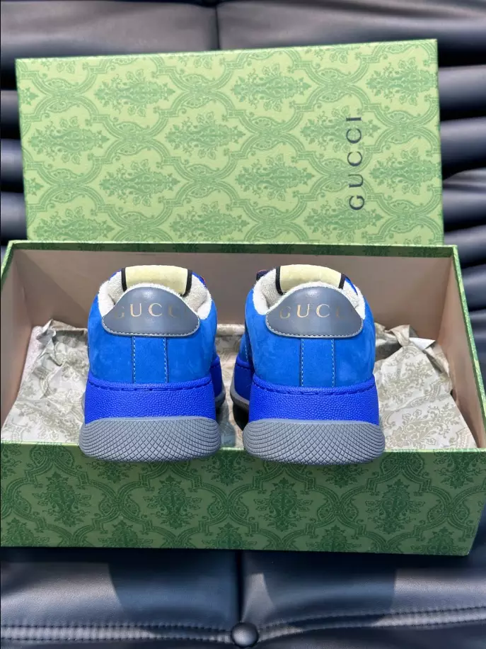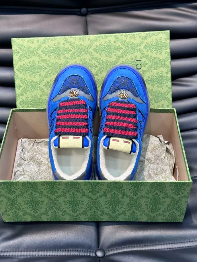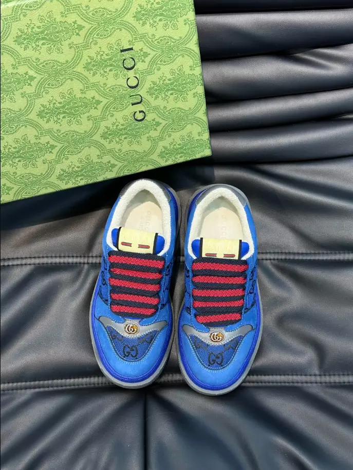#GucciScreener #GGCanvas #BlueBlackSneakers #DoubleGDetail #VintageGucci #FashionFootwear #FlatformSole #ChunkyLaces #LowHeel #LuxurySneakers #GucciStyle