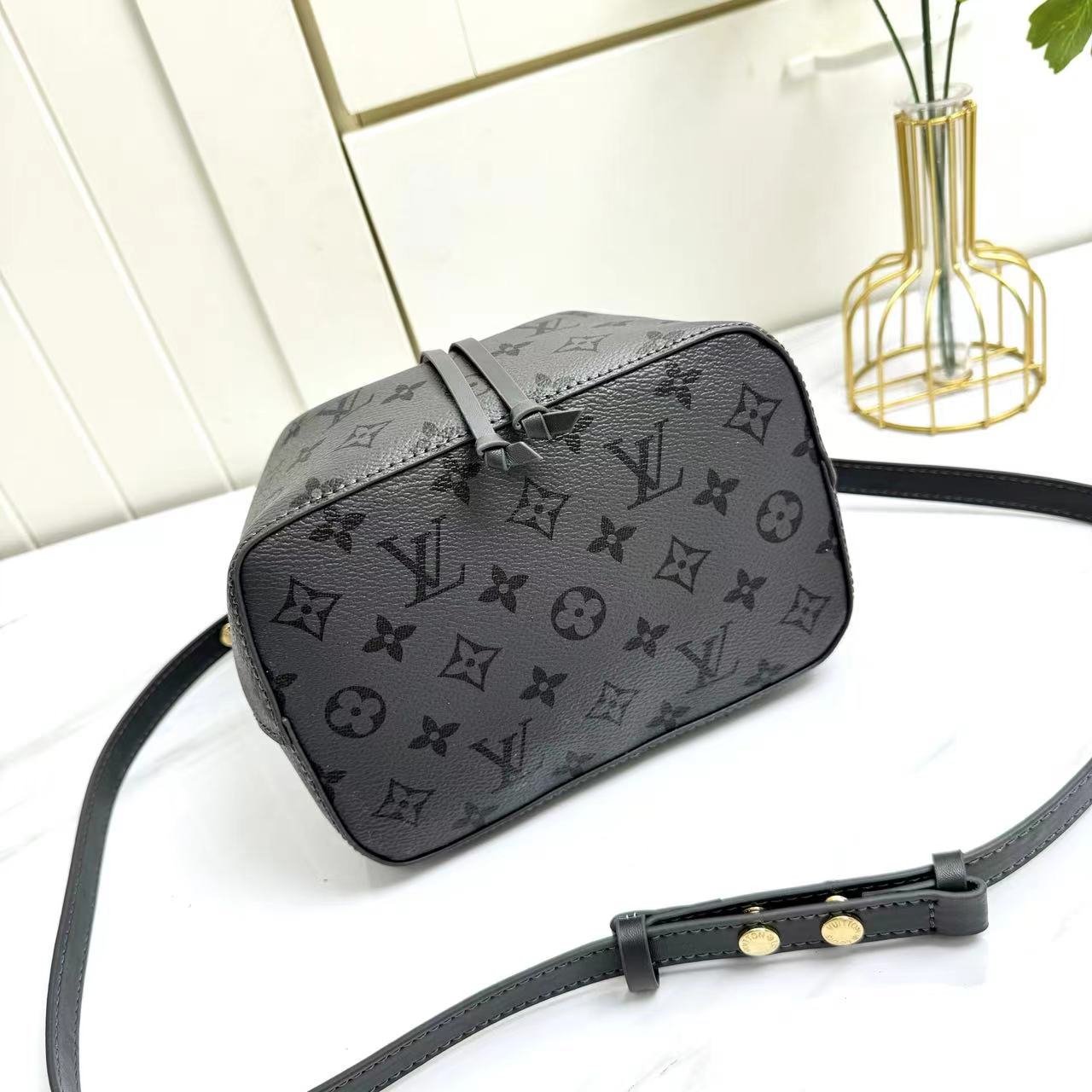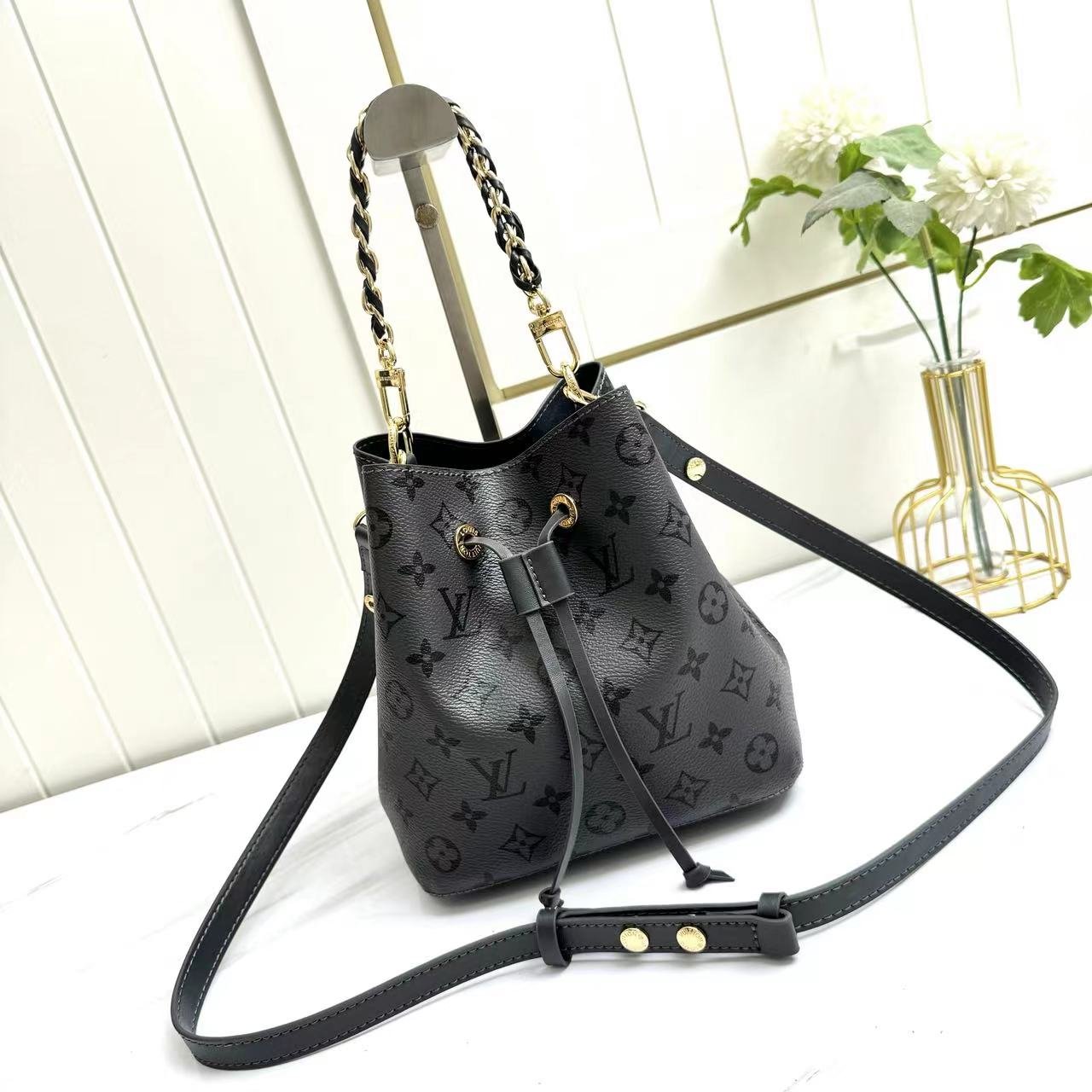 Model: 12749 bucket bag series NÉONOÉ BB handbag. The Neoono on BB made of Monogram canvas material decorated with natural leather. The iconic Neono of the house reinterprets the bucket bag into a small-sized design. It has ample storage space for carrying necessities such as keys, AirPods and iPhones. A leather cord that can safely store carried items. With a detachable handle and a detachable and adjustable strap, it is an item that can be styled in various ways. 20 x 20 x 13 cm.