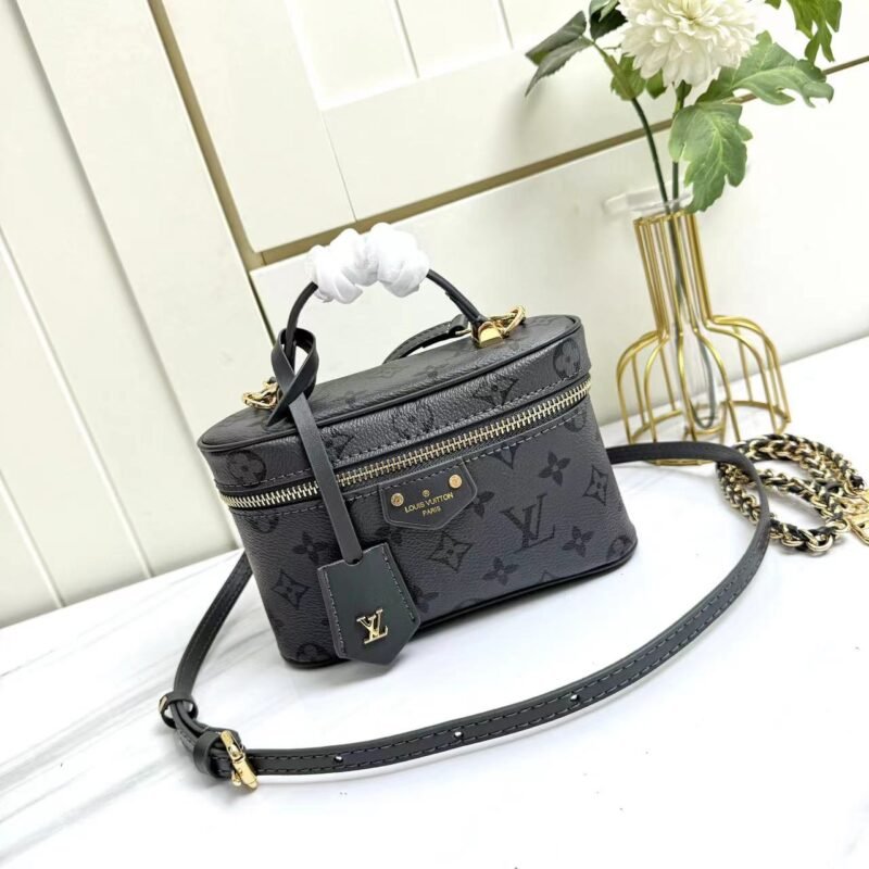 Drawing inspiration from the classic cosmetic case, the handbag interprets the spirit of travel in Monogram canvas. The top handle and removable braided chain blend in with leather elements to complement the concise lines of the bag body. The LV inscribed padlock and leather key bag continue the signature details. 19 x 11.5 x 6.5 cm