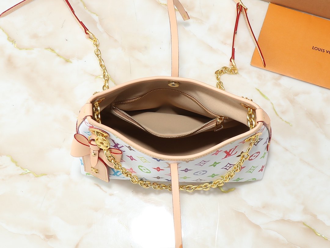The upgraded M13014 M24860 CarryAll BB bag is crafted from Monogram canvas, featuring Monogram flowers embellished with eye-catching chains, perfect for both day and night occasions. The leather plaque and tie closure complement each other beautifully, while the zippered interior pocket makes it convenient to access credit cards. Dimensions: 26.0 x 17.0 x 10.0 cm