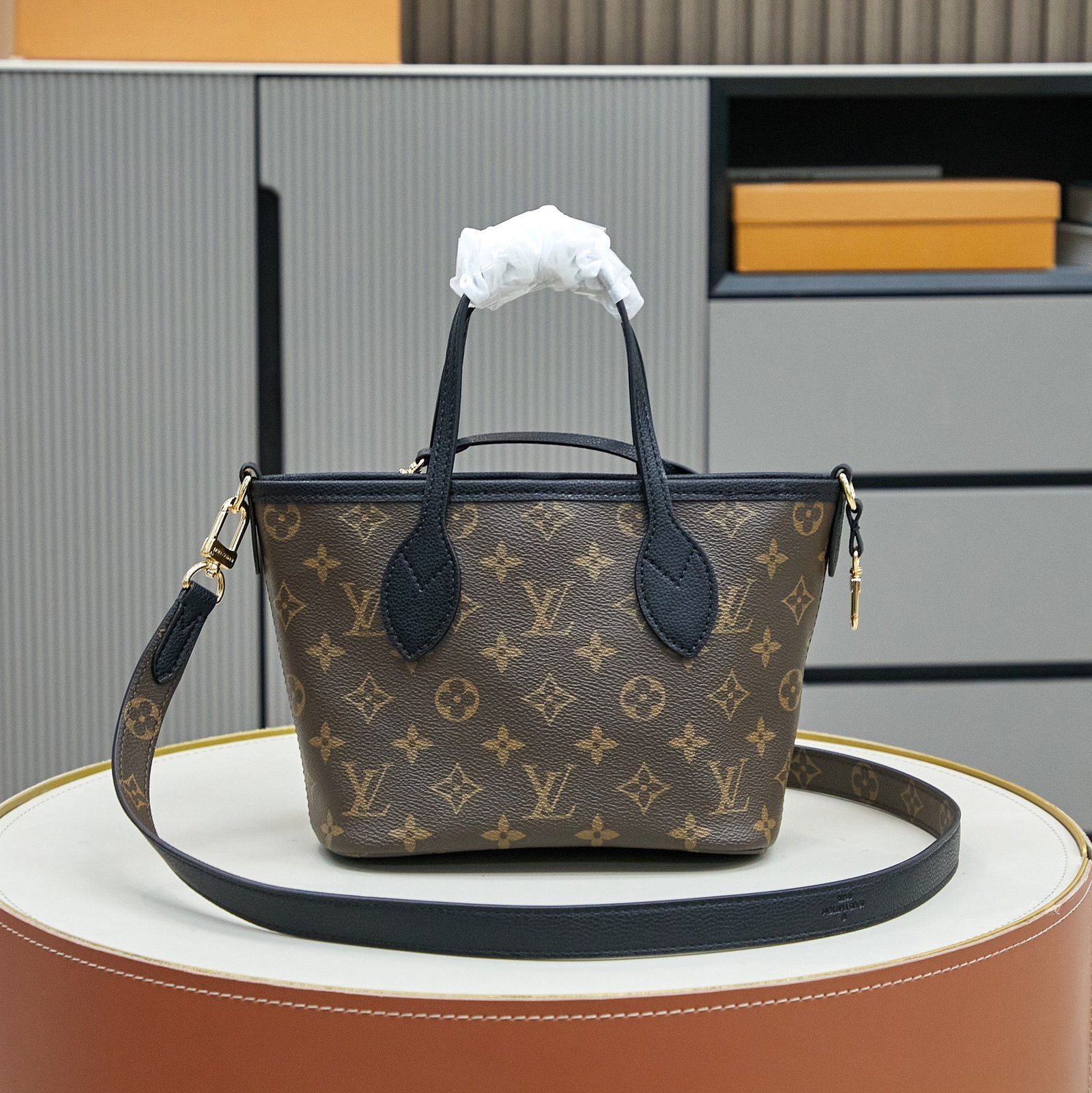 M12099.M12109.M12106.The double-sided shopping bag collection Neverfull Bandoulière Inside Out BB handbag, the iconic Neverfull handbag is reversible. The Bandoulière Inside Out BB edition is made from iconic Monogram canvas and has a grained leather on the back. It comes with a removable zippered bag that can be used alone or attached as an external pocket. Sparkling gold hardware adds that final touch. It also features removable straps that allow for crossbody. Dimensions: 24 x 14 x 9 cm