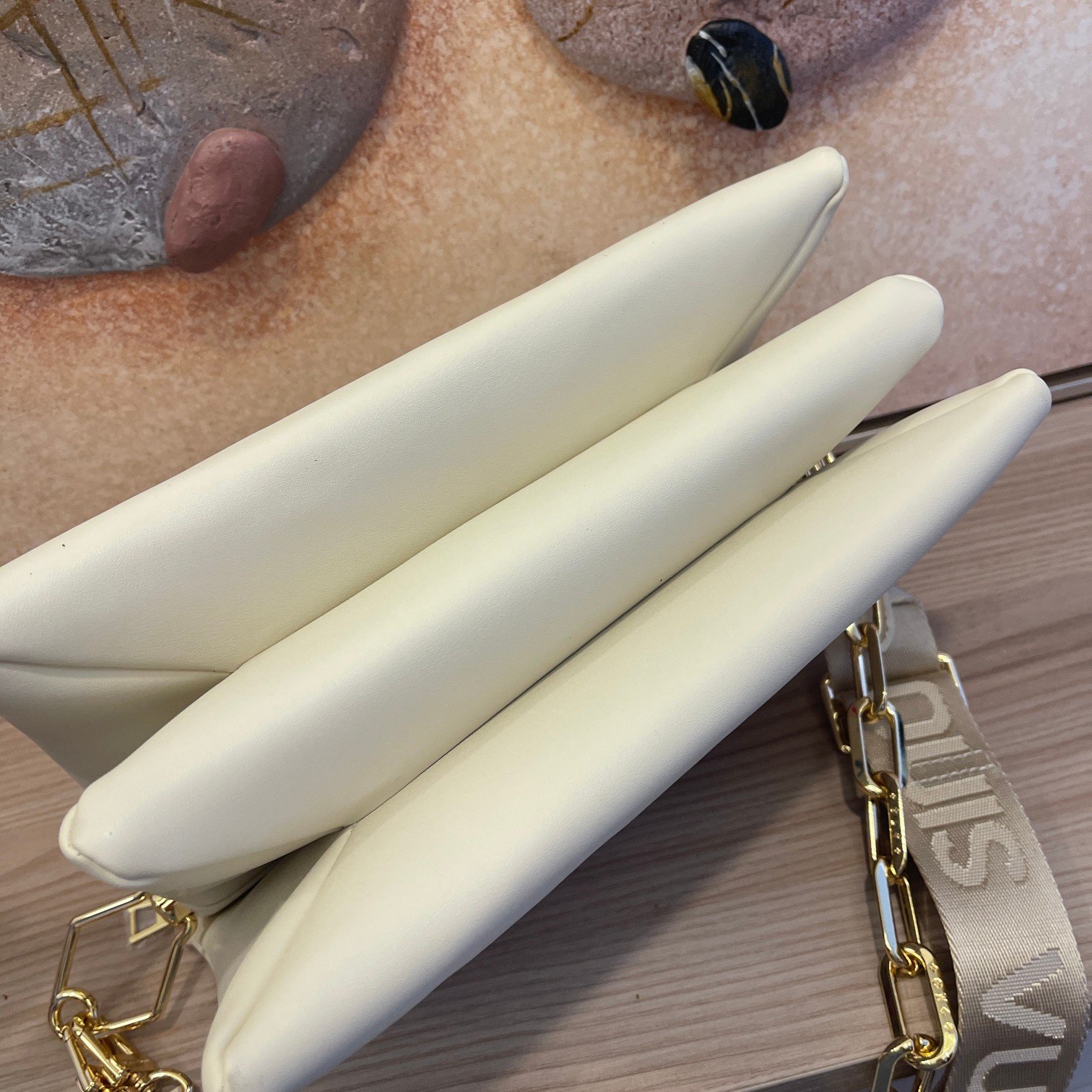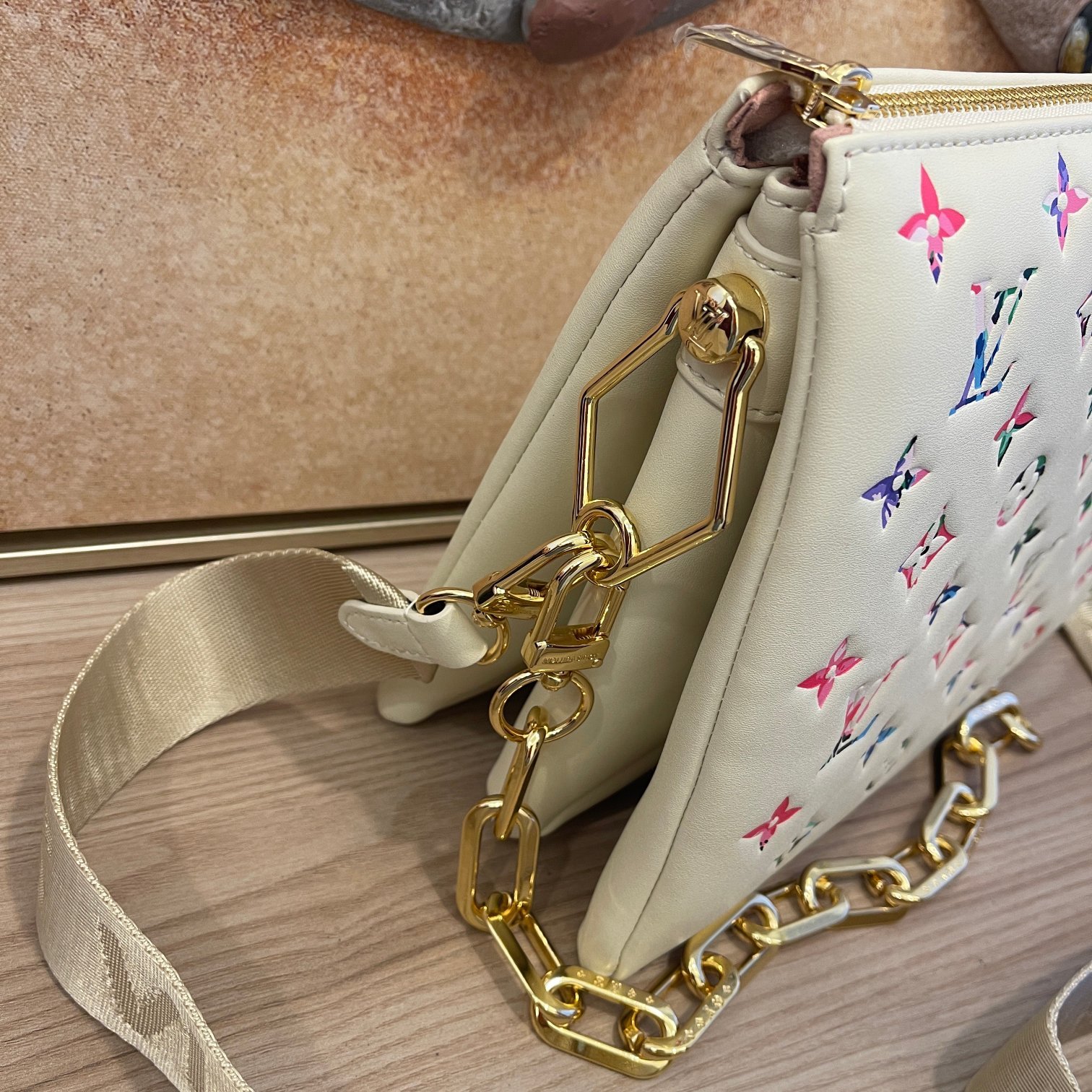 The top-of-the-line original M57793 57790 apricot Coussin small handbag shines at the Spring/Summer 2021 fashion show. Monogram embossed fluffy sheepskin creates a pillow configuration that injects avant-garde style into the minimalist design. Can be carried under the arm with a strap crossbody or an avatar chain baguette bag. Dimensions: 26 x 20 x 12 cm