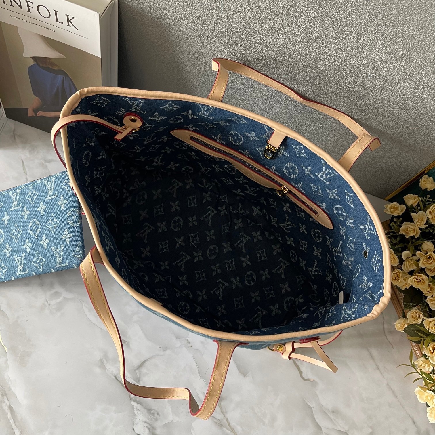 Upgraded version 1M40995 medium denim jacquard denim shopping bag 💋💋 Louis Vuitton’s new Neverfull reinterprets the classic handbag and explores the delicate details inside the bag. The redesigned inner bag features a fresh fabric lining and retro details inspired by the Louis Vuitton archives. The most remarkable is the detachable zippered clutch, which can be used alone as a delicate clutch or as an additional pocket. The bright lining color adds more liveliness to the Monogram classic canvas. Size: 32*29*17 cm.