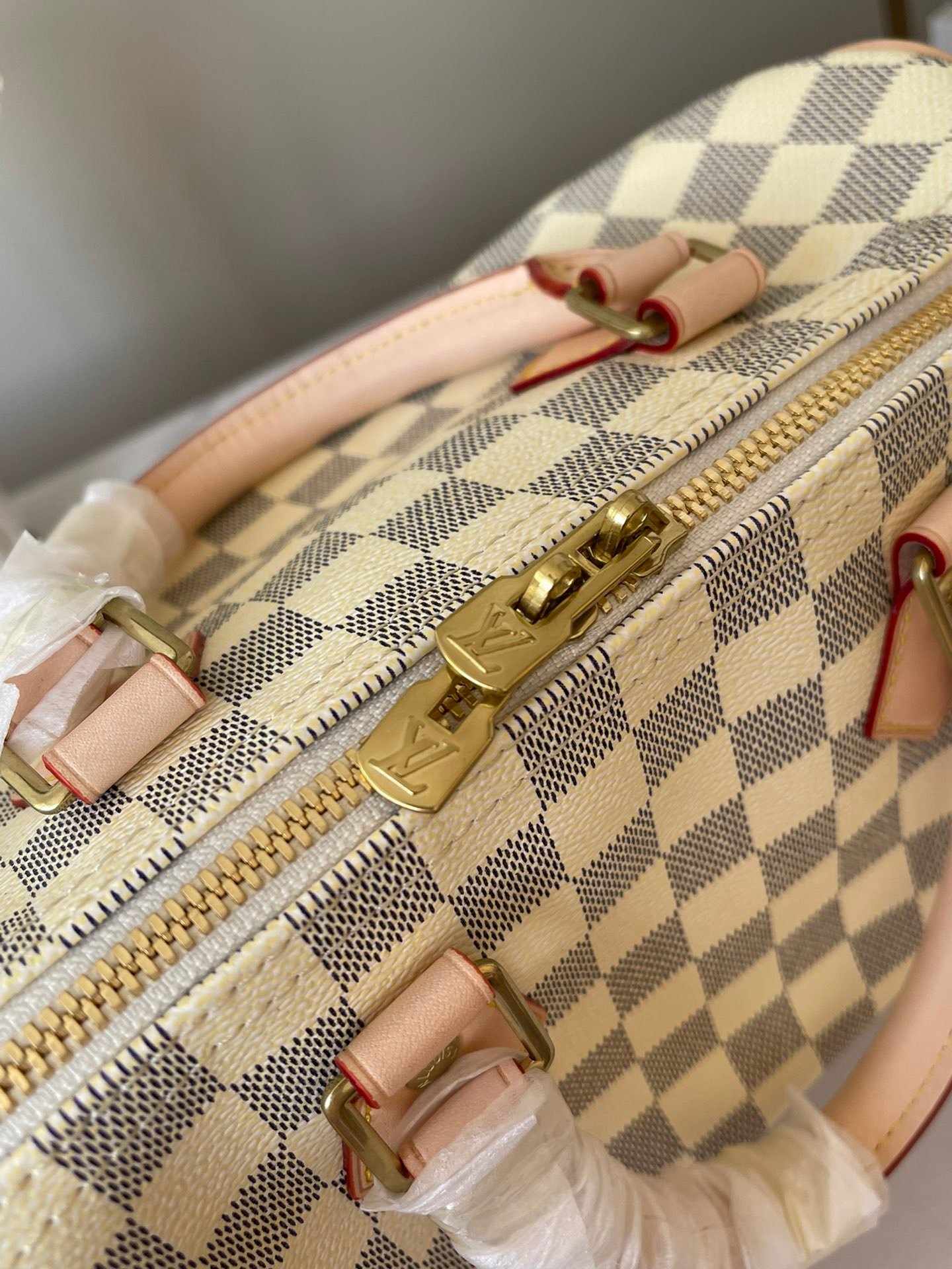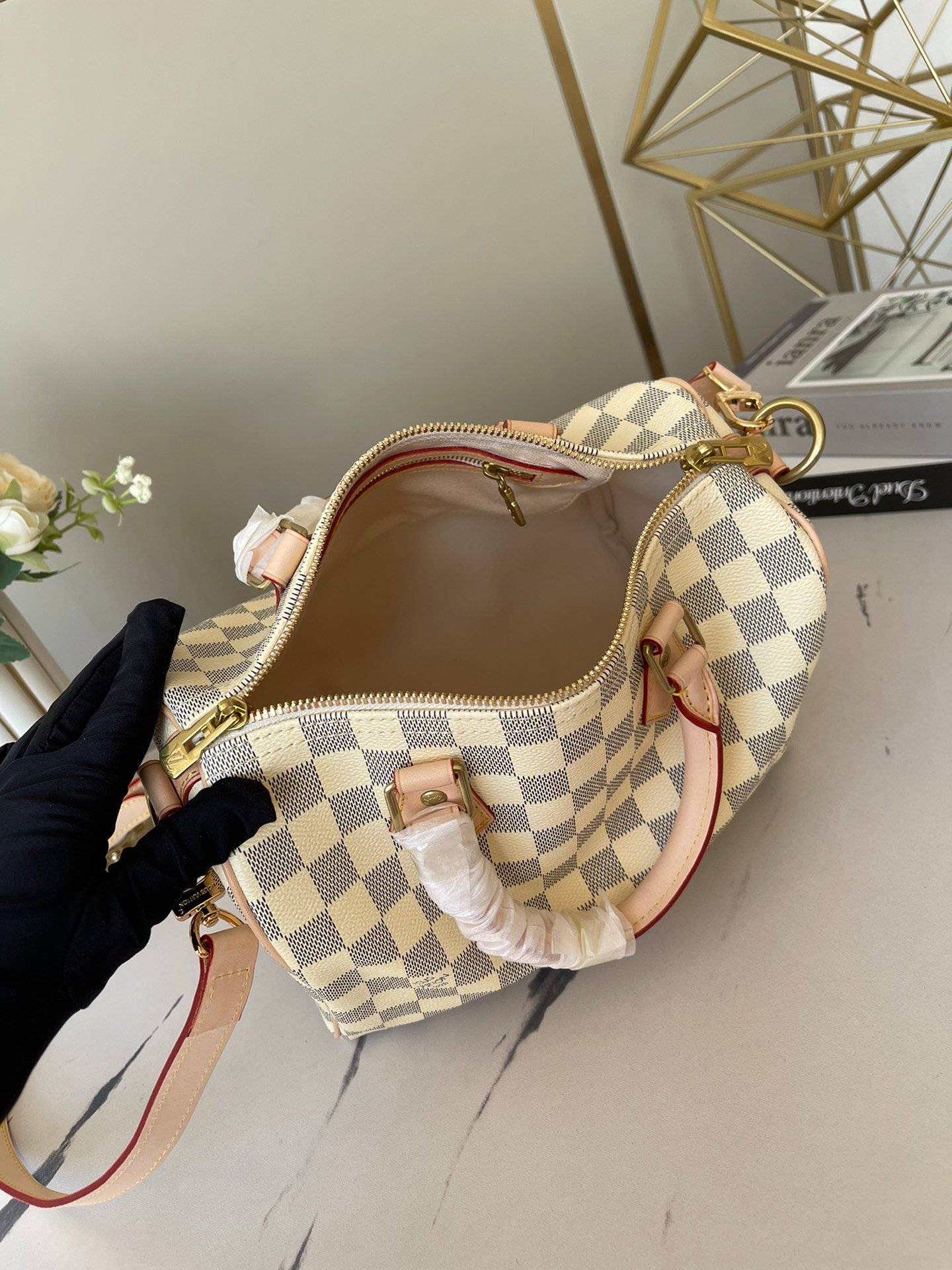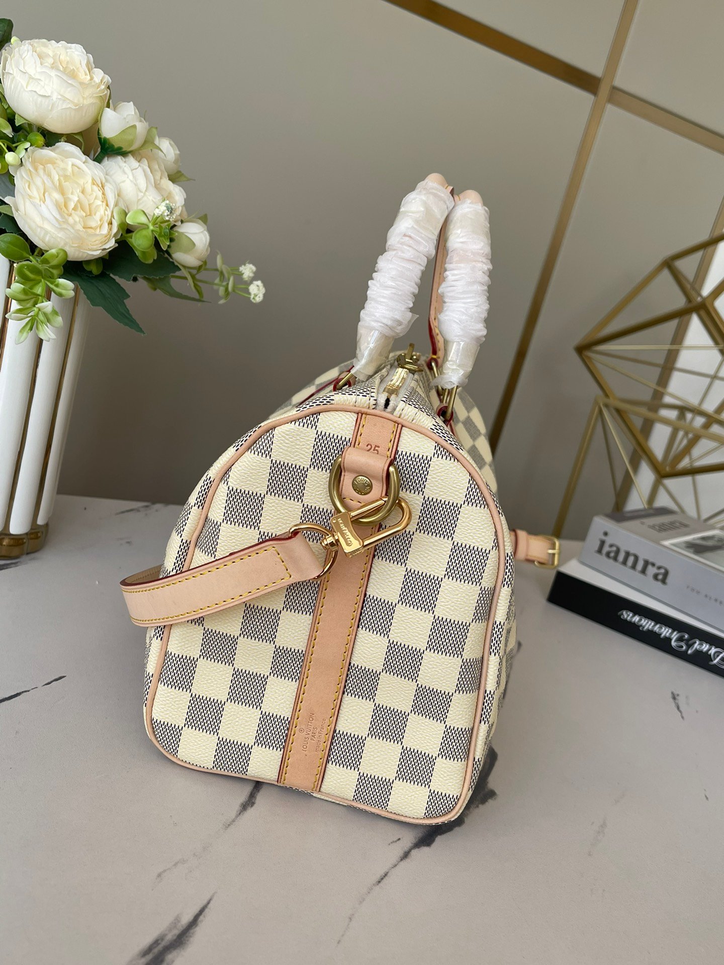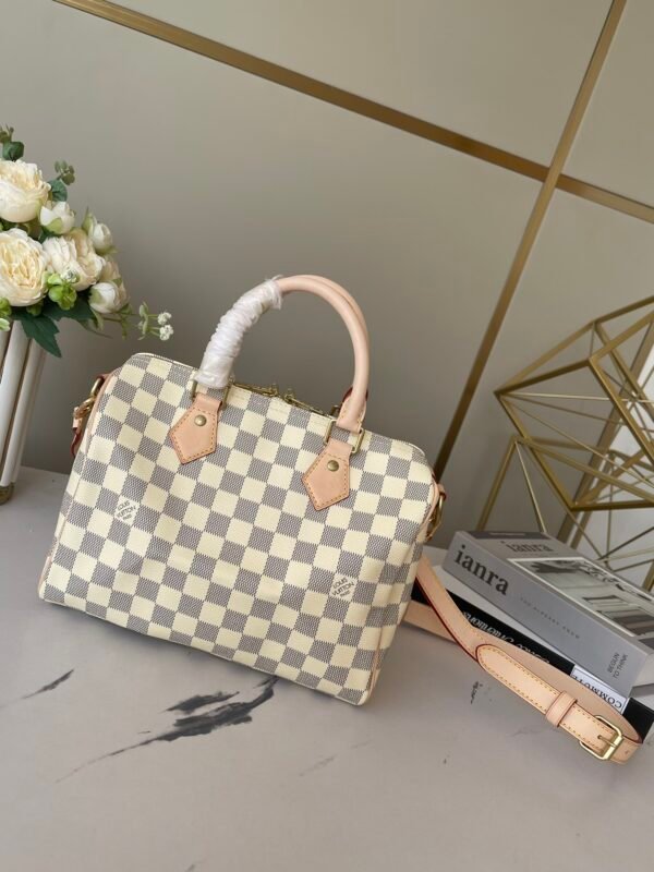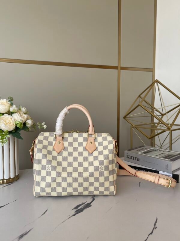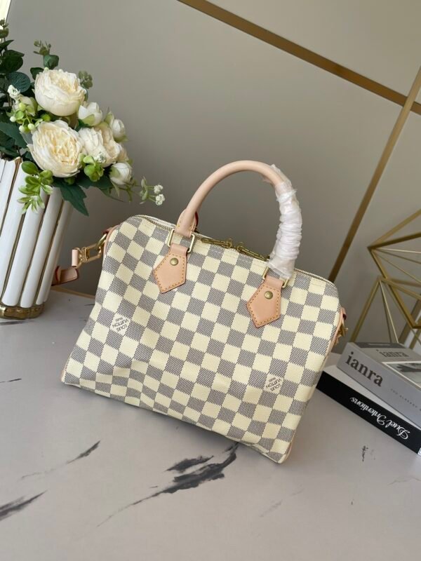 This AAAAA quality bag ✨ [Top original order, exclusive real shot] M41113 White Grid Speedy 25 Handbag is an ideal urban handbag. The iconic shape and classic Monogram canvas, plus multiple carry methods and luxurious natural cowhide trims add a fashion-forward feel to the bag. Shiny gold metal accessories and padlocks A lockable double zipper open-in-one inner bag A D-ring for hanging keys and accessories A soft fabric lining A removable, adjustable shoulder strap!!; Size: 25x19x15CM
