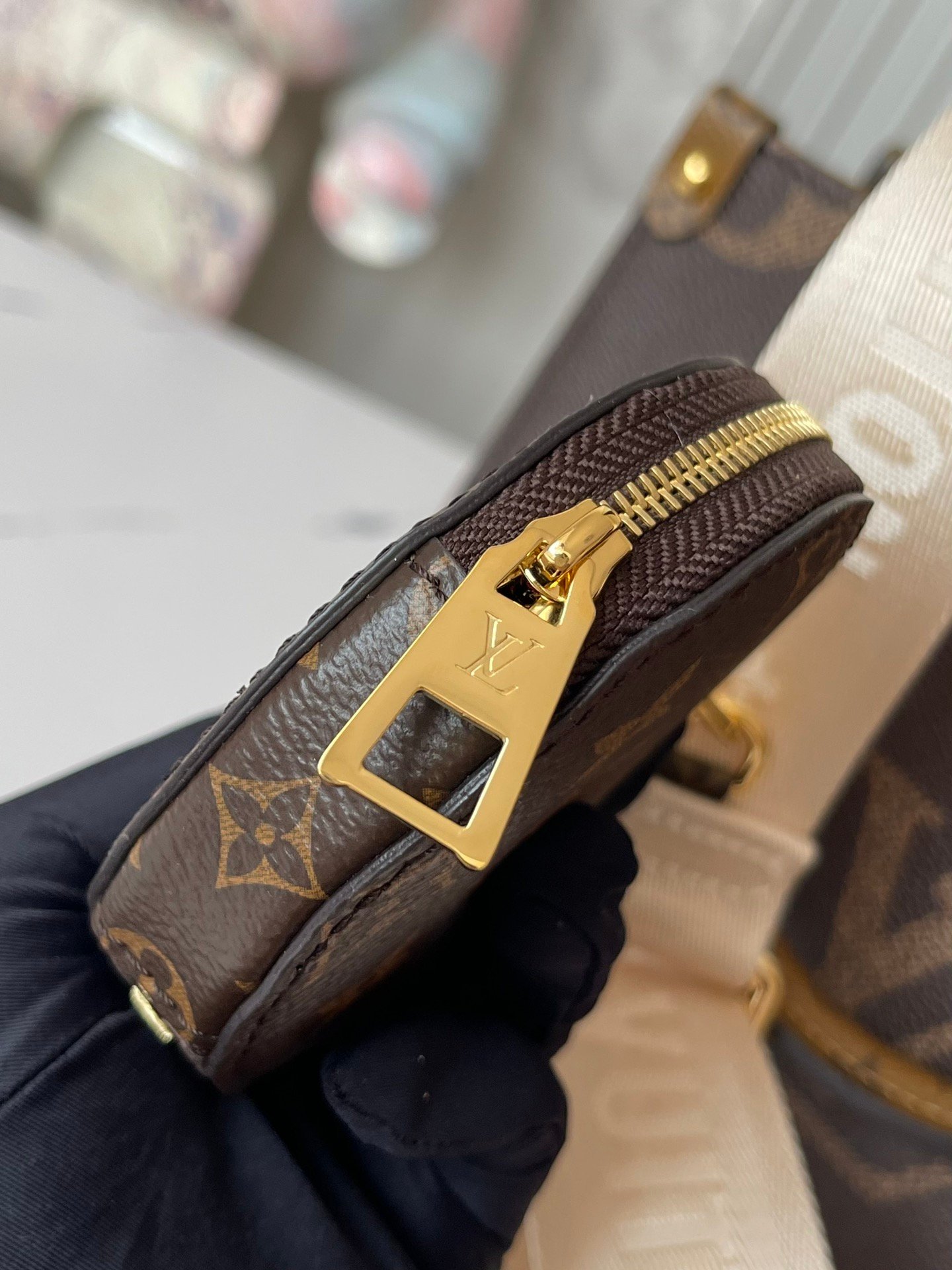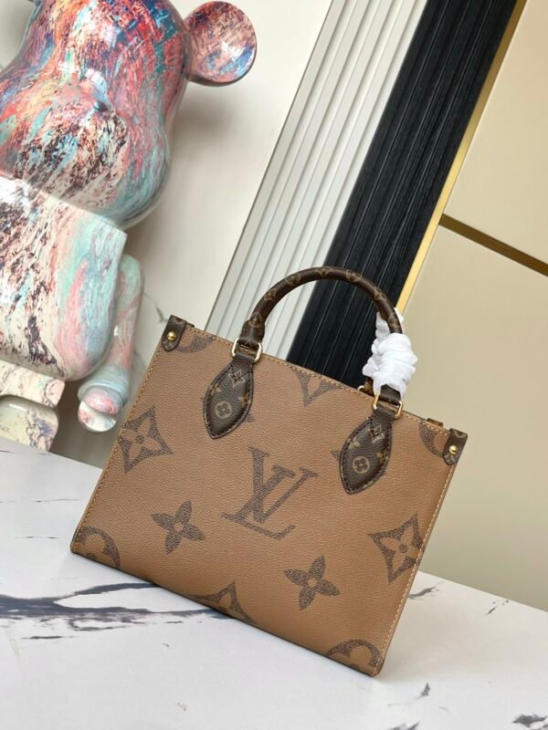 M46373 vintage, Mommy bag series. This OnTheGo small handbag combines Monogram and Monogram Reverse canvas, and the Monogram Giant pattern is embellished on it. The Toron handle and the jacquard woven shoulder strap decorated with the brand’s inscription create a visual contrast. The detachable change purse is suitable for storing change or small delicate items. With both fashionable charm and diverse functions, it becomes an excellent daily companion. 25.0 x 19.0 x 11.5 cm.
