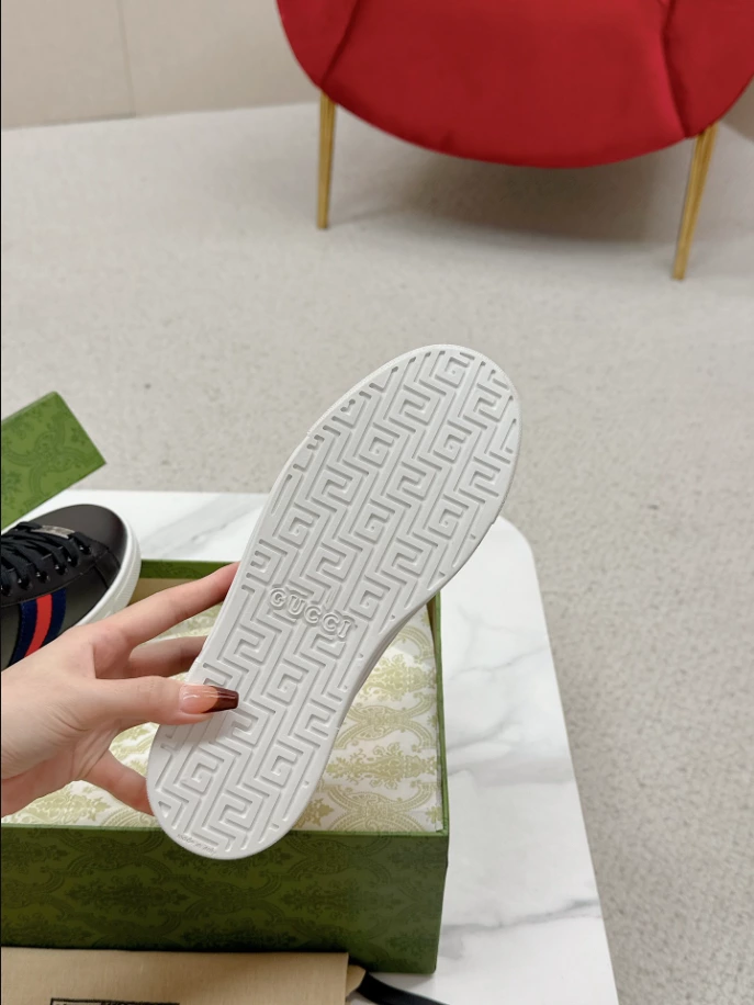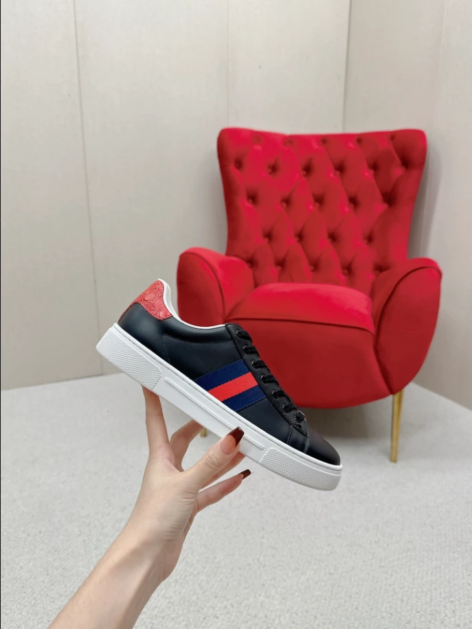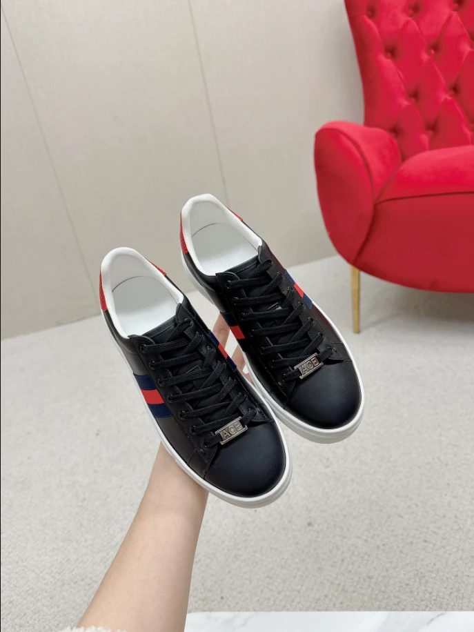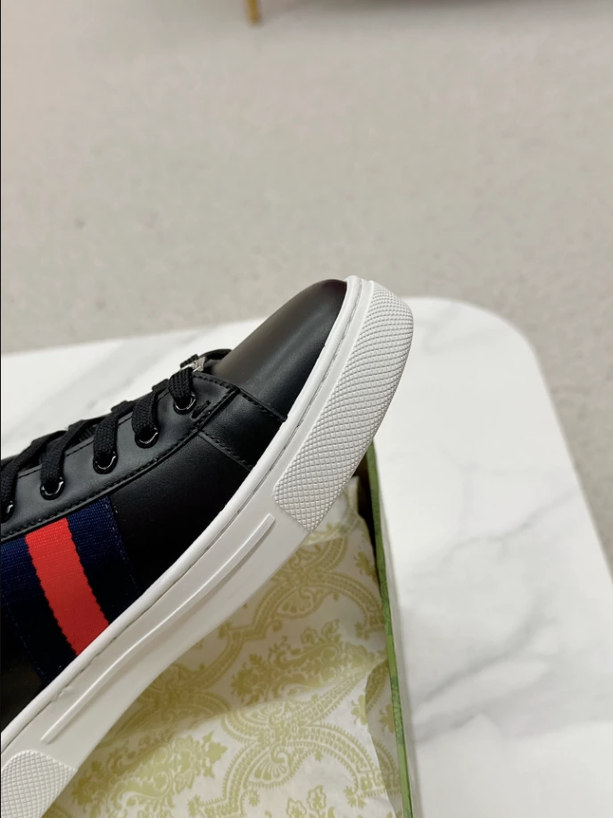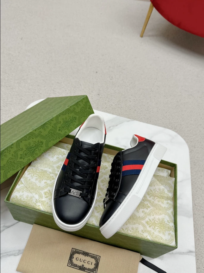 #GucciAceSneaker #MensFootwear #BlackLeather #BlueRedWeb #RedDetail #FashionableSneakers #ACEMetalTag #RubberSole #LaceUpClosure #TimelessDesign
