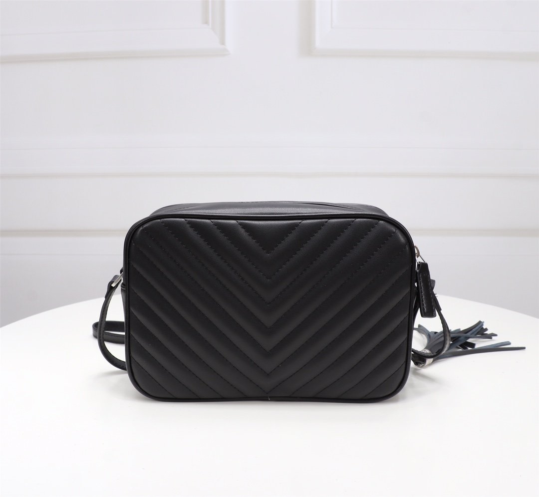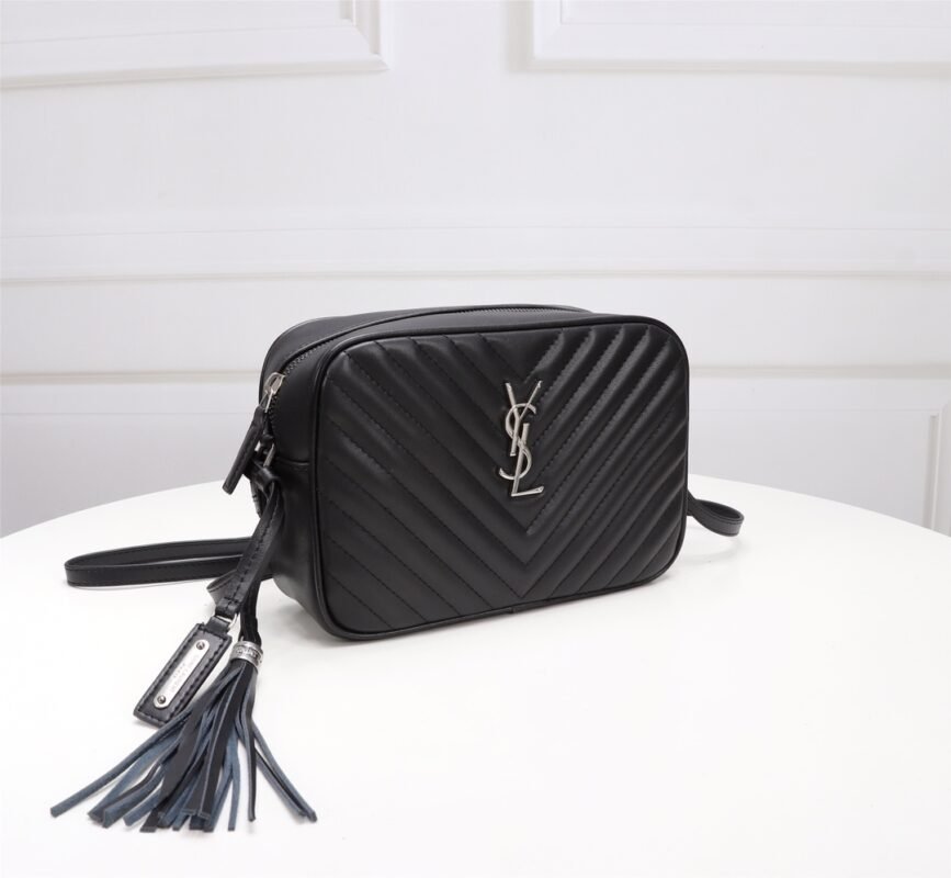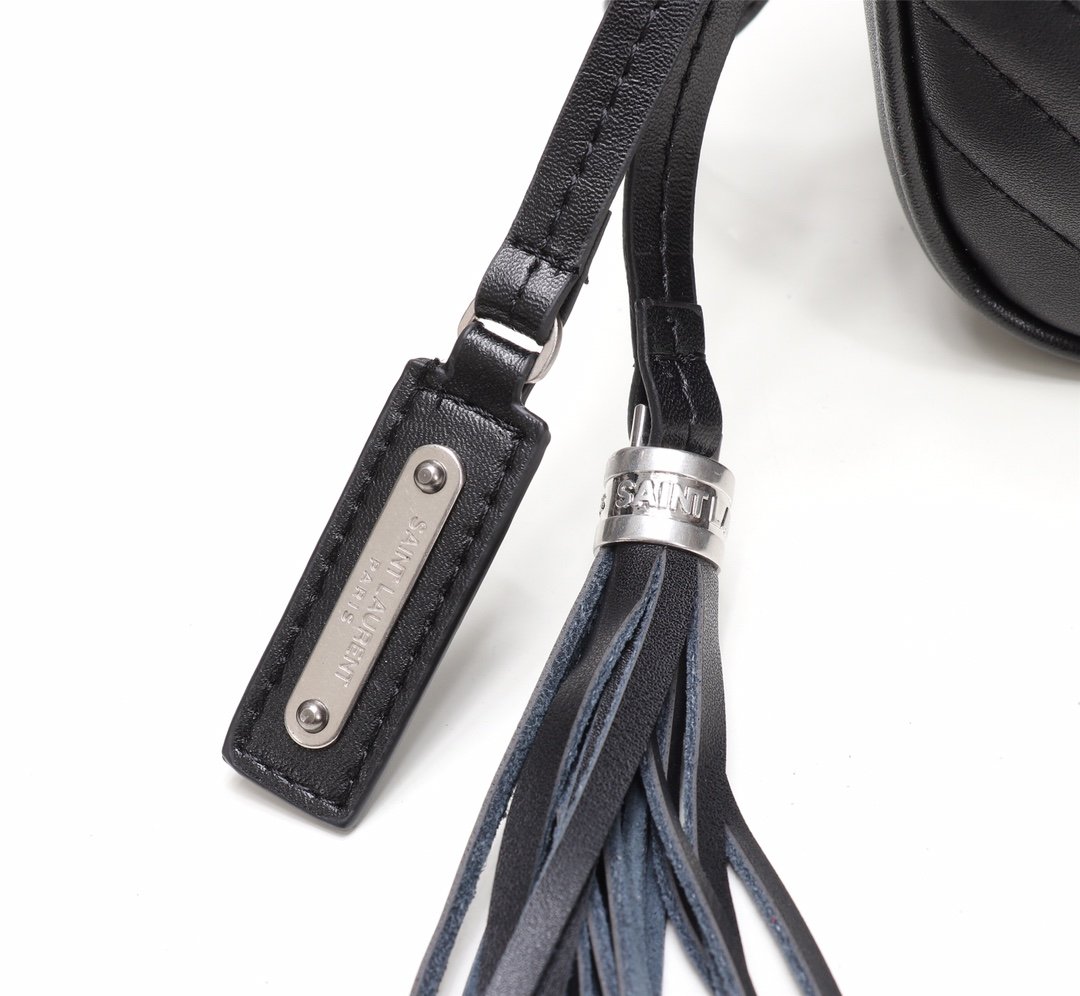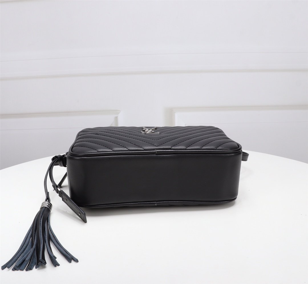 Cowhide with box. Saint Laurent camera bag, very delicate! Adjustable shoulder strap with stylish tassel pendant! Satin lining! There is an inner insert pocket in the bag! Very practical and elegant! Size: 23x16x6cm.